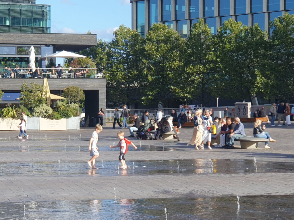Sally: Yes, there is and that has brought families. The larger public spaces have been here from the start and are always packed with children and families playing in the fountains. They are still creating new, smaller play spaces for children and young people as new buildings open and more families move in.