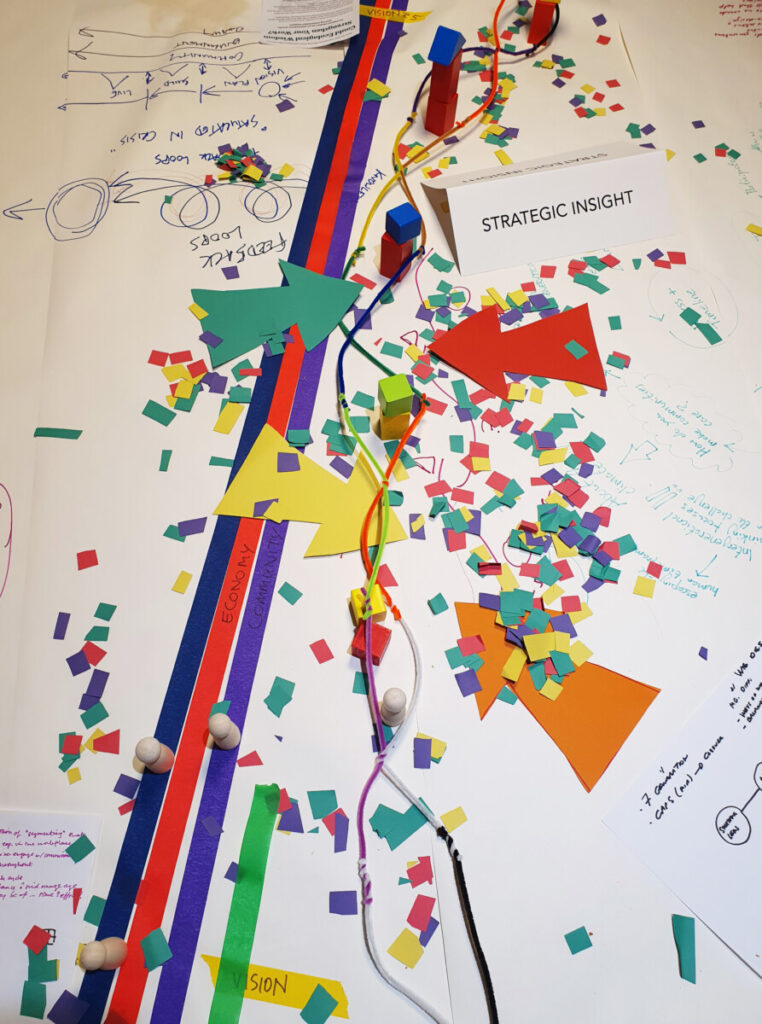 Their model depicted a kind of double helix structure, which represented the evolving nature of a vision for a place that is never simply linear. It also illustrated the continuums within a place that run alongside and inform any project, such as health and wellbeing, economy and community. They positioned blocks along the path of their vision helix to represent stages over an extended period of up to 25 years, with loops circling round to illustrate continuous feedback, reevaluation and iteration. Confetti that was sprinkled on either side and across the table represented the many ideas and contributions of people, some of which make it into the vision and some not, but all with their place in the collective journey.